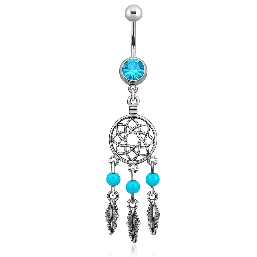 Legyél Te is divatos és stílusos ezzel a különleges álomfogós köldök piercinggel, amely garantáltan kiemel a tömegből. A szemet gyönyörködtető türkiz kövek és a ragyogó strasszkövek segítségével minden alkalommal különleges megjelenést kölcsönözhetsz magadnak.