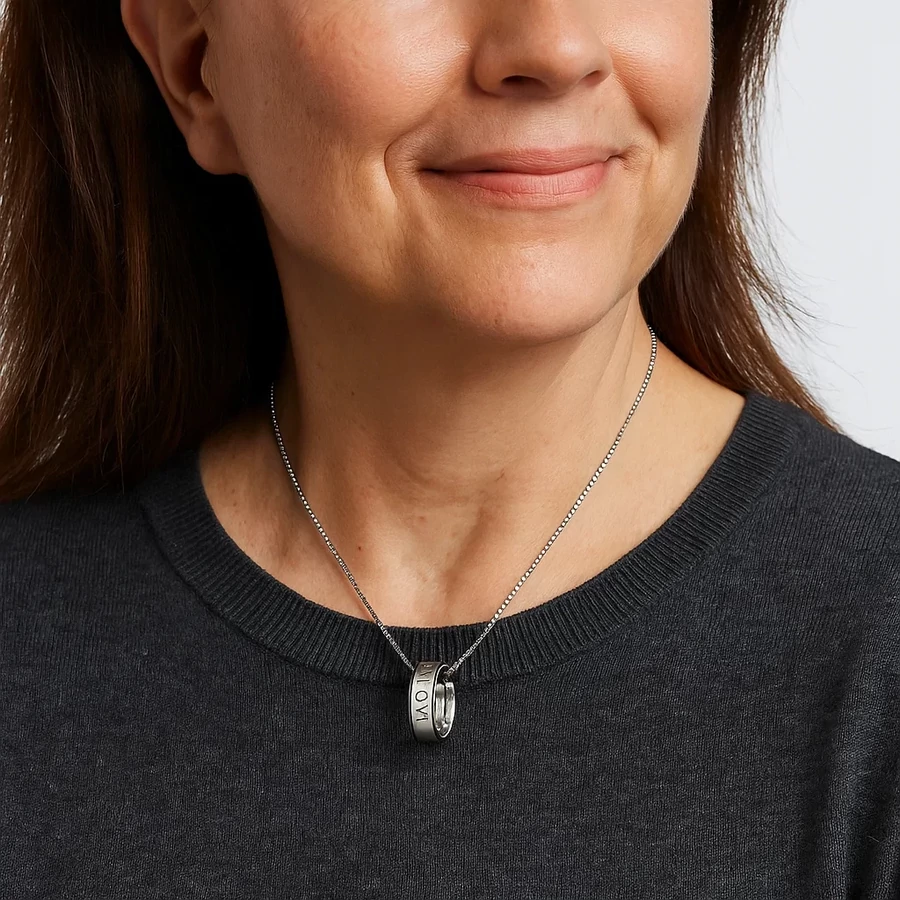 Az acél anya gyűrűs nyaklánc egy érzelmekkel teli és stílusos ékszer, amely tökéletesen kifejezi, mennyire fontos számodra az anyukád. A középpontban egy különleges, ezüst színű gyűrű áll, amelyet a nyakláncra fűzve lehet viselni – így ez a darab egyesíti a klasszikus nyakláncot és a gyűrűt. Két ékszer egyben, mégis visszafogott és elegáns megjelenéssel.