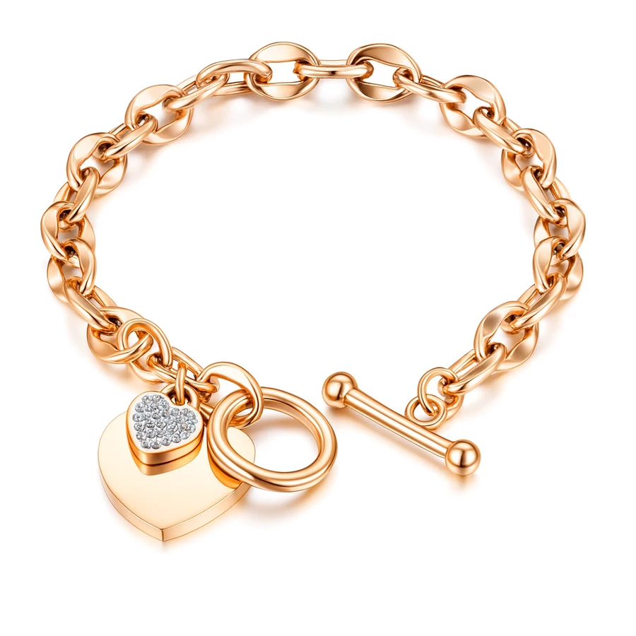 Elegáns acél dupla szíves karkötő OT záras csattal, amely romantikus és modern megjelenést biztosít. Tartós rozsdamentes acélból készült, tökéletes ajándék minden alkalomra.