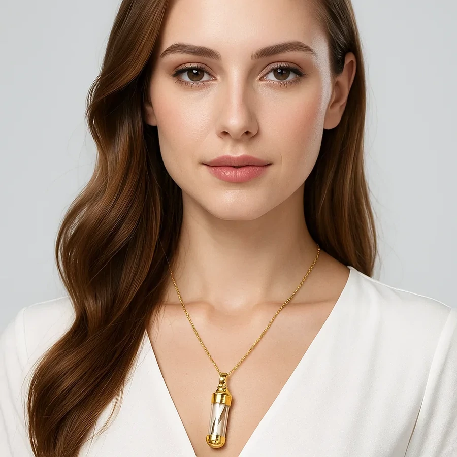 Ez a nyaklánc túlmutat az ékszer szerepén: lehet benne egy korty kedvenc parfümből, egy csöpp illóolaj, vagy akár egy apró emlék – valami, ami közel áll a szívedhez. Ha szereted a jelentéssel bíró darabokat, ez a nyaklánc egy igazi kincs lesz a számodra.
