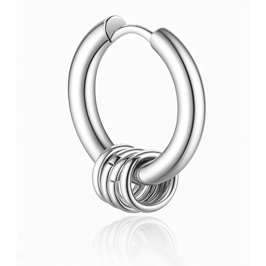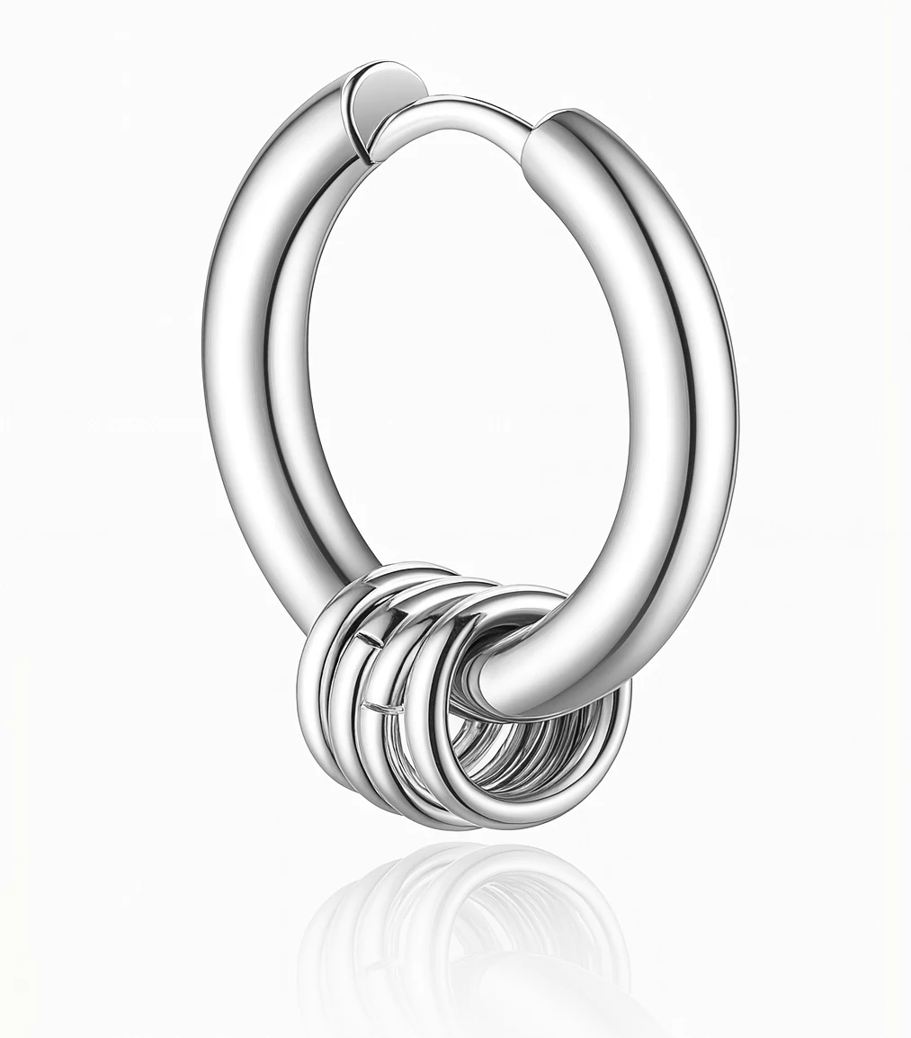 Ez az ezüst tribal fülbevaló igazi különlegesség a modern férfi ékszerek világában. A rozsdamentes acél alapot öt kis, kör alakú medál teszi még karakteresebbé, melyek mozgás közben dinamizmust visznek a megjelenésbe. A 15 mm átmérő pont ideális méret a feltűnéshez, de nem hivalkodó.