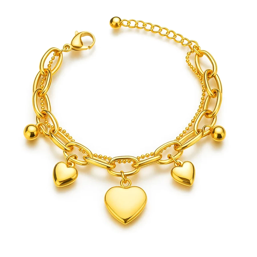 Ez az elegáns aranyozott szíves karkötő egy gyönyörű és kifejező kiegészítő, amely stílust és érzelmet is közvetít. A csillogó aranyszín és a finoman kidolgozott szív alakú medálok különlegessé teszik, így kiváló ajándék lehet bármilyen romantikus alkalomra – legyen szó Valentin-napról, évfordulóról vagy születésnapról.
