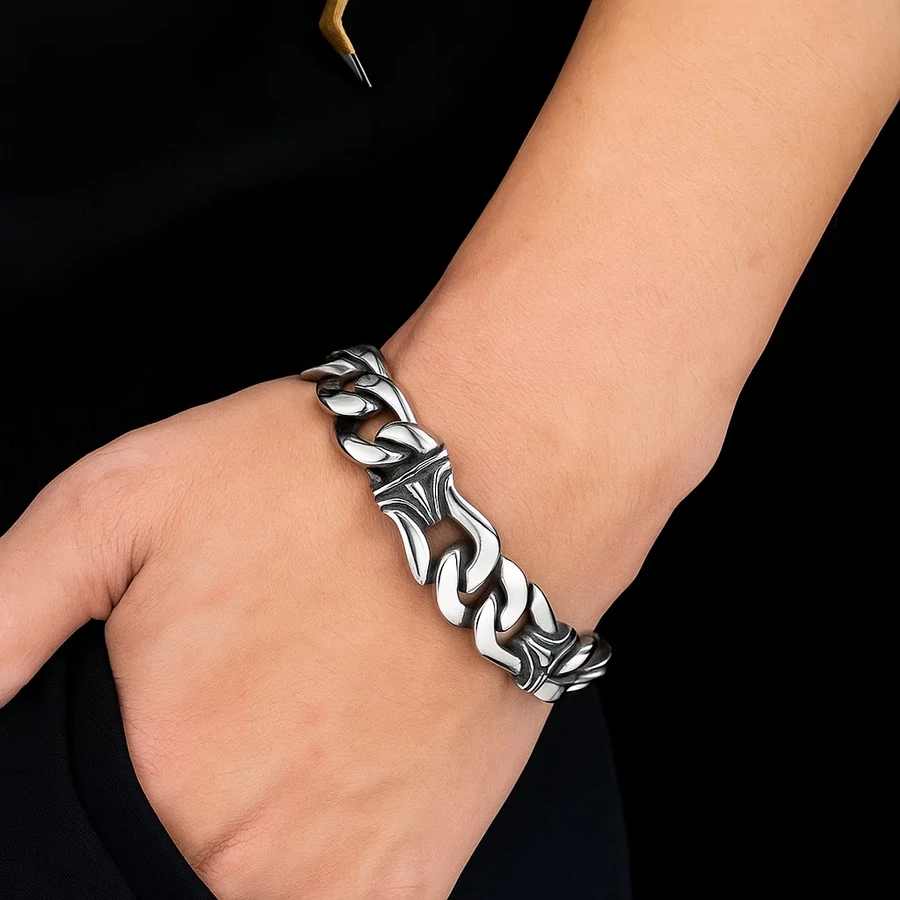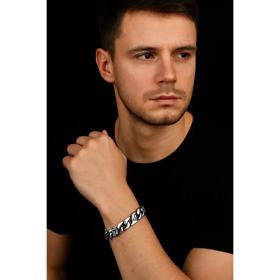 A karkötő kialakítása kifejezetten azokhoz szól, akik vonzódnak a motoros stílushoz, a rocker divathoz vagy egyszerűen csak szeretik az erőt sugárzó kiegészítőket. Jól kombinálható más férfi acél karkötőkkel is.