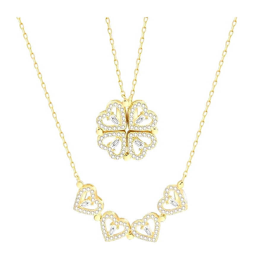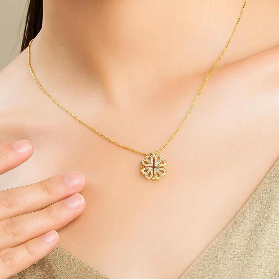 Ez a strasszos kihajtható lóherés nyaklánc nemcsak látványos ékszer, hanem egy gyönyörű szimbólum is. A mágneses, kihajtható medál varázslatos átalakulása – egy lóheréből négy szív – igazán különlegessé és személyessé teszi ezt az acél nyakláncot. Az aranyszínű lánc finoman kiegészíti a csillogó strasszokat, eleganciát és ragyogást csempészve a mindennapokba.